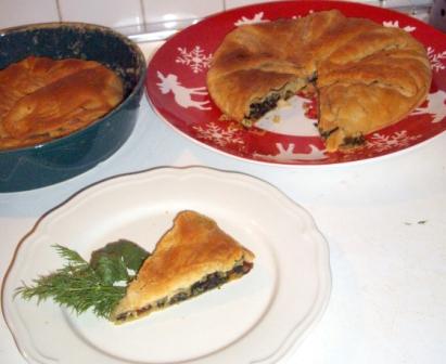 Ανοίγετε τα φύλλα, όσο πιο λεπτά μπορείτε. Σε λαδωμένο ταψί βάζετε τα τρία πρώτα, λαδώνοντας πάντα ανάμεσα. Μετά ρίχνετε τη γέμιση και τη μοιράζετε σε όλη την πίτα. Καλύβετε (<καλύβα) με το τέταρτο φύλλο και γυρνάτε τις άκρες των τριών πρώτων.